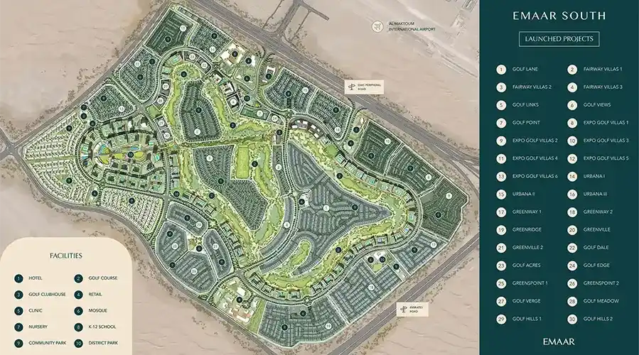 Master Plan of Golf Hills 2 development of a natural and balanced community within Dubai South is the goal of Emaar Properties. Development will include residential areas containing 1-3 bedroom apartments and 3 bedroom townhouses that will be surrounded by landscaped green land and walks, and a view of the golf course. The recreational parks, retail stores, and family parks are situated at strategic points, and the social and active lifestyle has been encouraged. This design is geared towards open spaces, proper road networks, and sustainability that would see to it that there will be a balanced relationship between the convenience of an urban setup and the natural beauty.