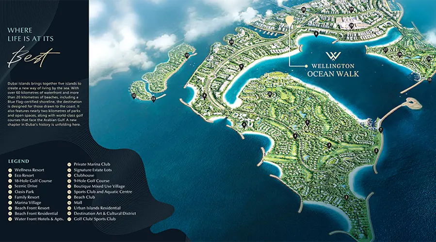 Wellington Ocean Walk at Dubai Islands is designed to appeal to people who like the finest lifestyle, coupled with a modern, elegant lifestyle. The development is located in one of the most beautiful waterfronts in Dubai and is still linked to the business and leisure world of this city. The architecture is centred on straight lines, open spaces, and nature, which provide the residents with the luxurious impression of space and calmness. The scenery motivates one to live a beautiful life every day because the sun sets in the ocean to the shining skyline at night.